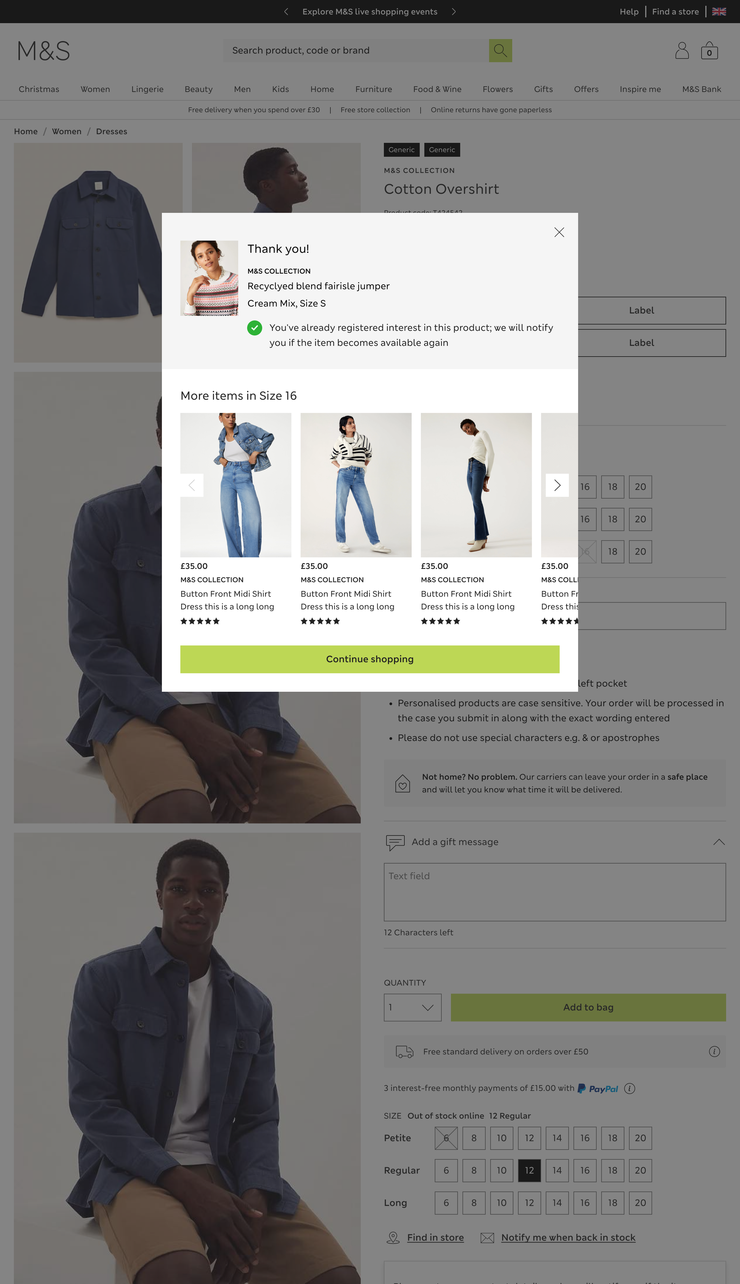 The Design sprint we ran produced a number of strong ideas for experimentation. As a team we prioritised 9 ideas with our product managers and designed up the experiments for M&S engineers on Figma. Attached is an example of one of these experiments, relating to personalised suggestions when clicking on an Out of stock item.