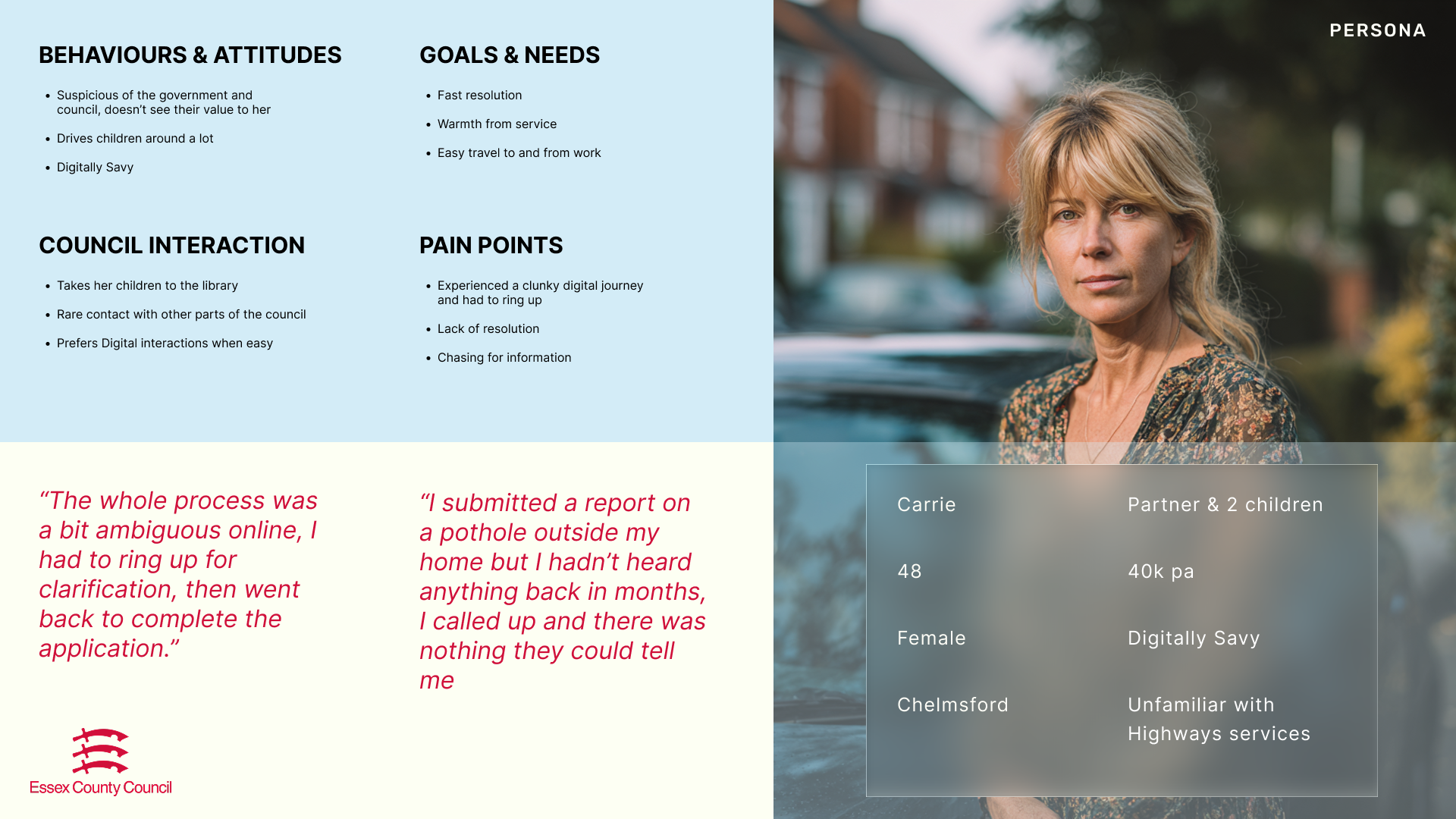This work gave ECC something it hadn't had before: a unified, evidence-based view of how residents actually experience its services, cutting through organisational silos.