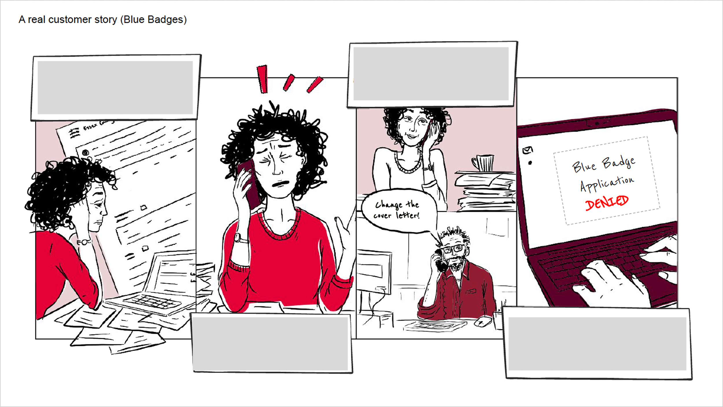 A storyboard we created to tell the story of our research. I like to produce these alongside Blueprints as they are better at communicating moments that matter to stakeholders