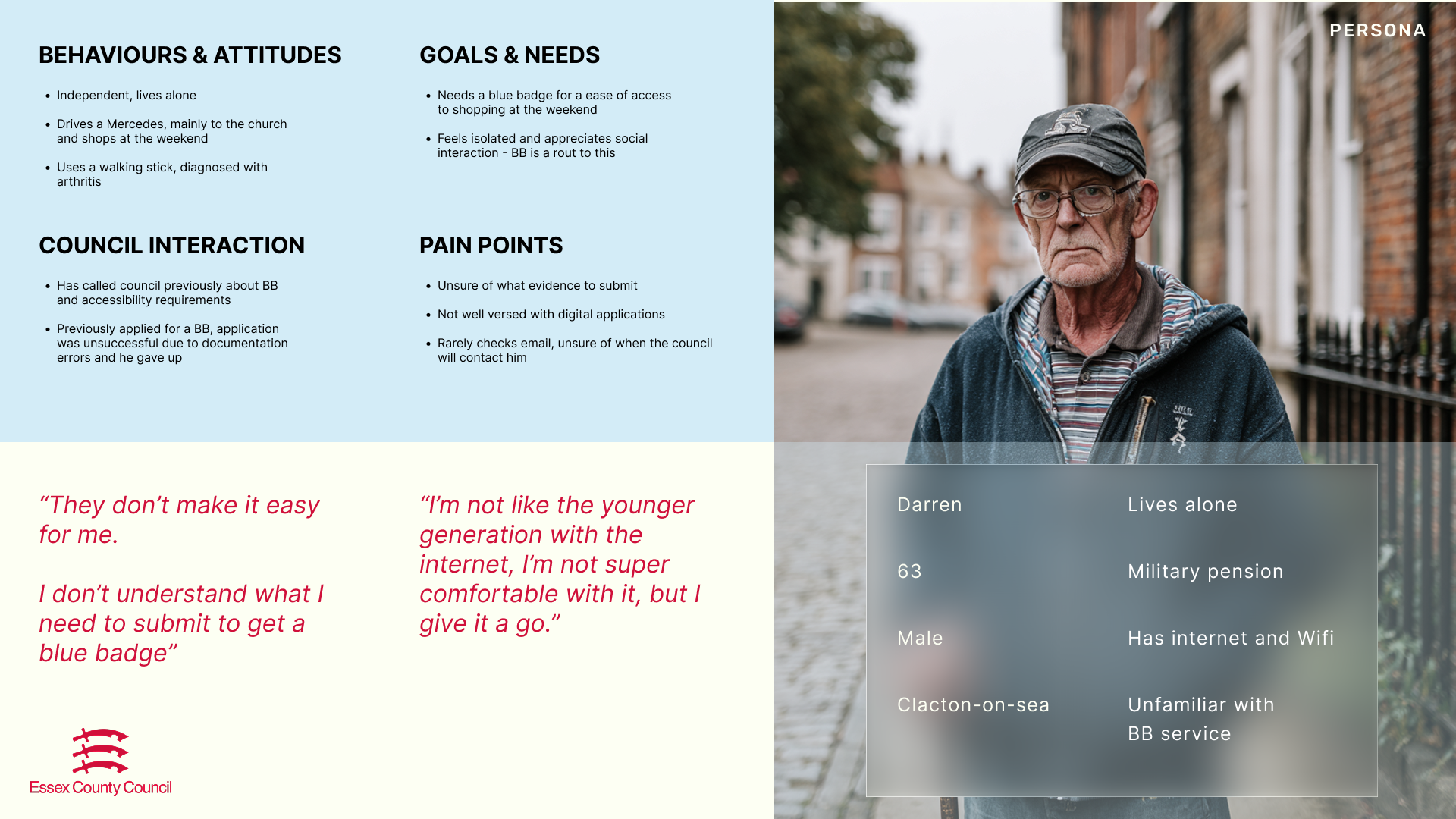 Amidst a whole-of-council transformation and ahead of Local Government Reorganisation, Essex County Council (ECC) recognised a critical opportunity to intentionally shape and improve how residents access and experience its services. ECC partnered with my company to adopt a 'one team' approach focused on understanding end-to-end resident journeys. I was the lead service designer on this project.